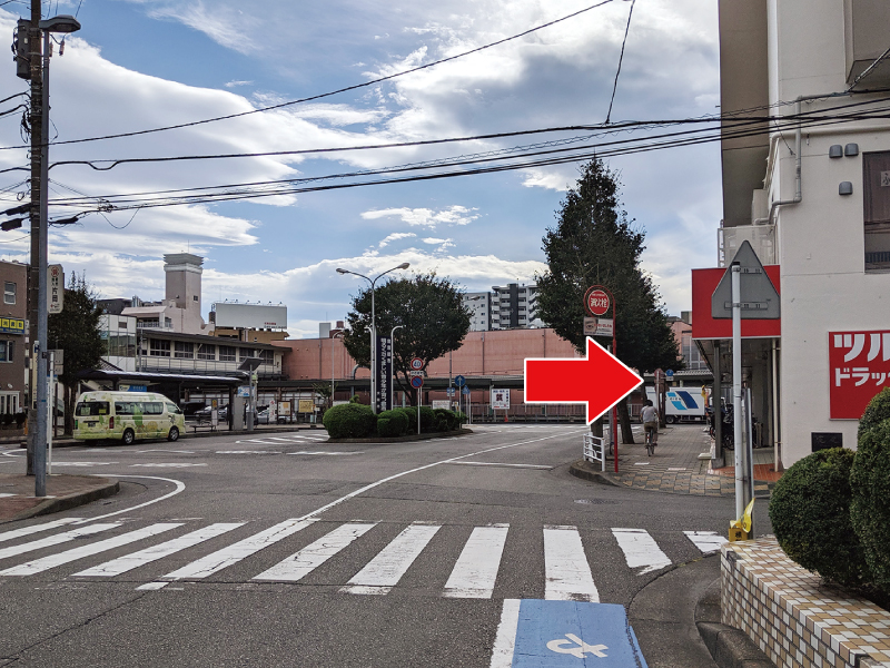 つきあたりの道を右折(本当に最後まで直進していただいて、線路を真正面に見て、交差点を右折してください。)