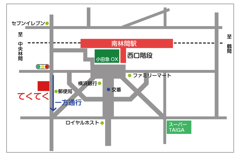 県立座間谷戸山公園から南林間駅西口に向かう道を進んでいただき、つきあたり(南林間駅西口が目の前に見える)を左折してください。