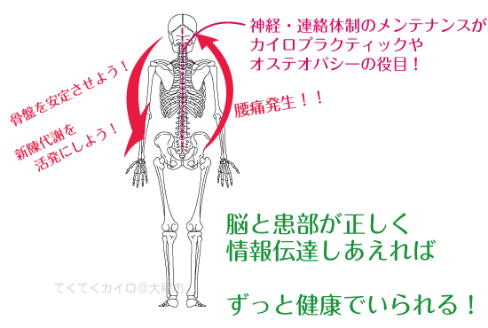 上述した神経伝達の正常化を目指す際、カイロプラクティックは特に骨格(主に背骨と骨盤)の正常化に有効な施術技術になります。