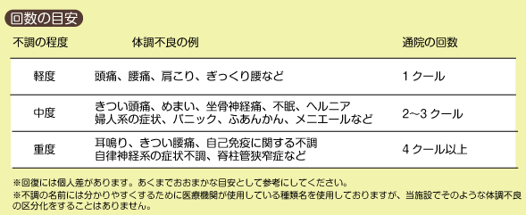 初めての方は初診+1クール(3ヶ月:6回)で「日常生活が辛くならないレベル」まで苦痛を減らすことを目標に施術していきます。