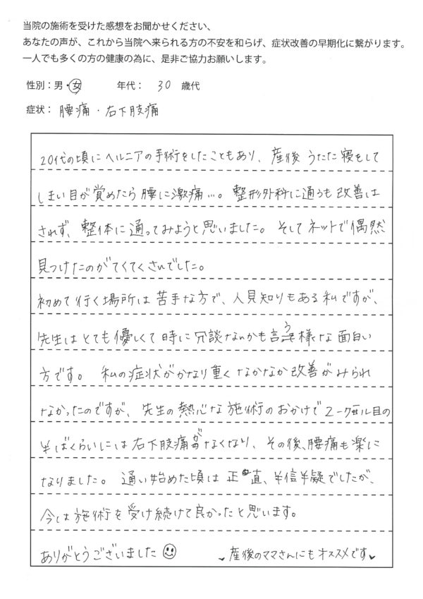私の症状がかなり重くなかなか改善がみられなかったのですが、先生の熱心な施術のおかげで2クール目の半ばくらいには右下肢痛がなくなり、その後、腰痛も楽になりました。